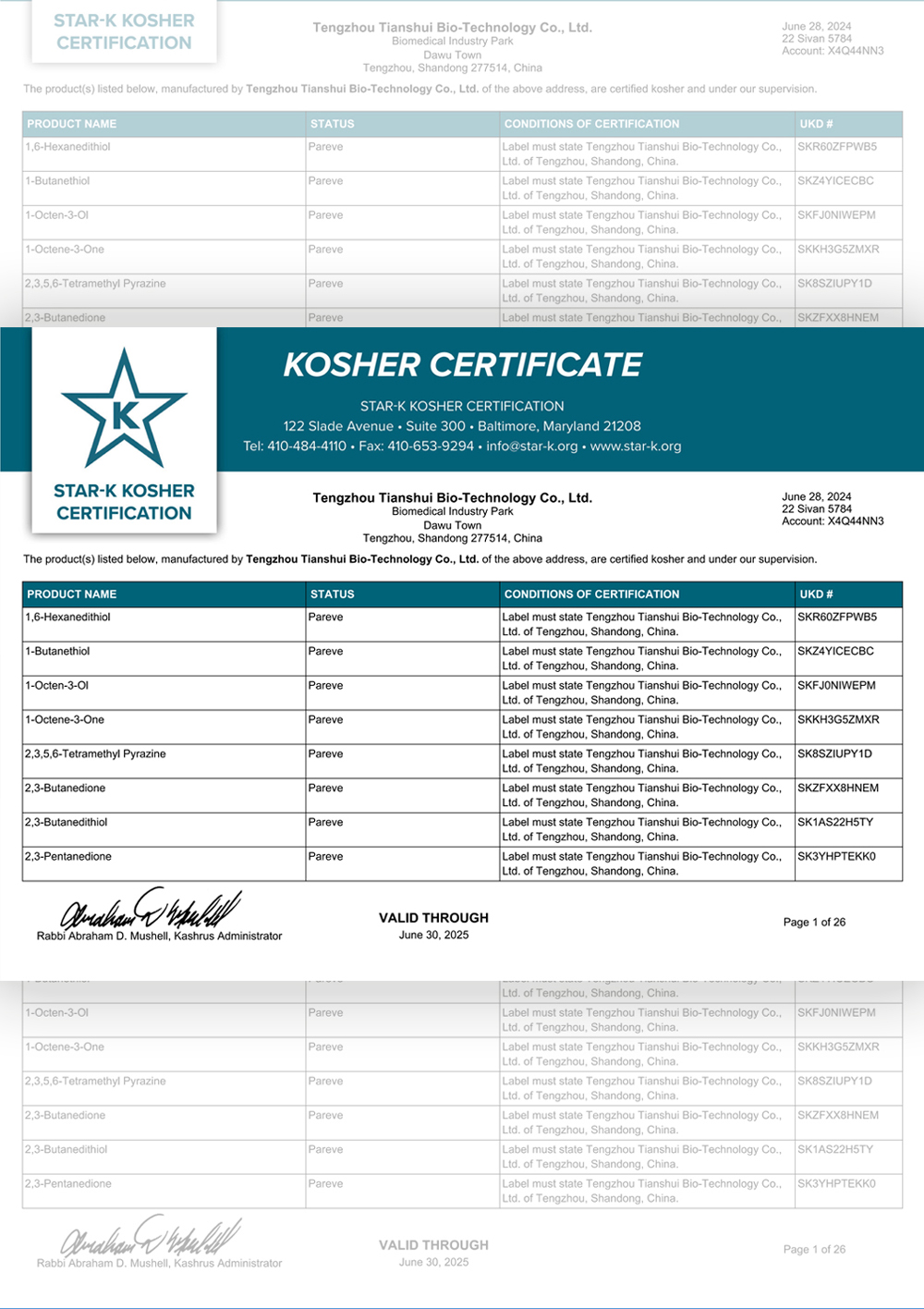 滕州市天水生物科技有限公司成立于2011年9月,是目前國內(nèi)雜環(huán)類合成食品香料、日化香料和醫(yī)藥中間體生產(chǎn)經(jīng)營的綜合性企業(yè)。坐落于山東省滕州市生物醫(yī)藥產(chǎn)業(yè)基地,總投資5000余萬元,占地面積約30000平方米,員工百余人。公司先后被評為高新技術(shù)企業(yè)、專精特新中小企業(yè)、科技型中小企業(yè),建有市級重點實驗室1處,并先后獲得ISO9001質(zhì)量體系認證、ISO22000食品安全體系認證、kosher認證和Halal認證。是香精香料及食品配料協(xié)會會員單位及滕州市中小企業(yè)協(xié)會理事單位。